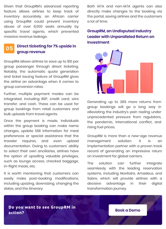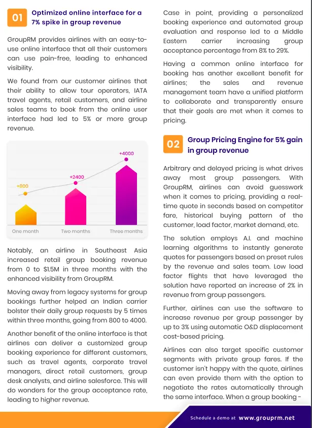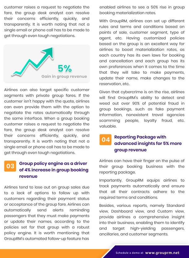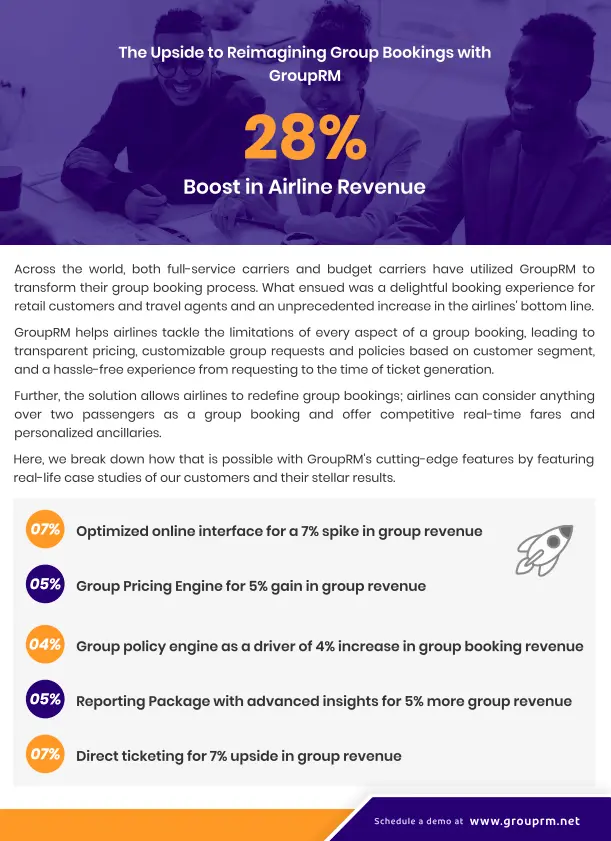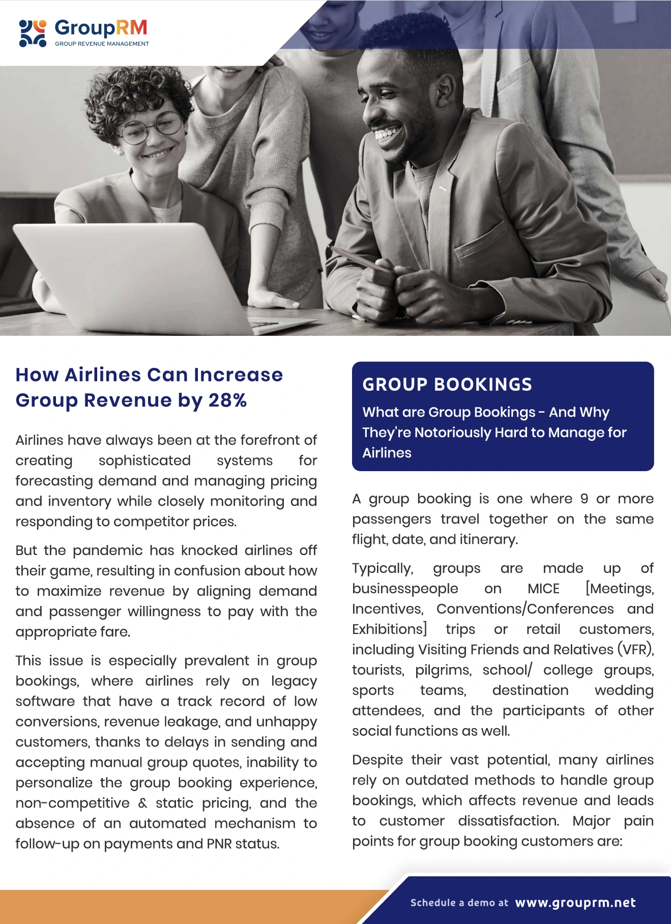 E-BOOK How Airlines Can Increase Group Revenue By 28% The downloadable covers how GroupRM, the AI-powered revenue management software, can help your airline increase group sales revenue by 28%. Download